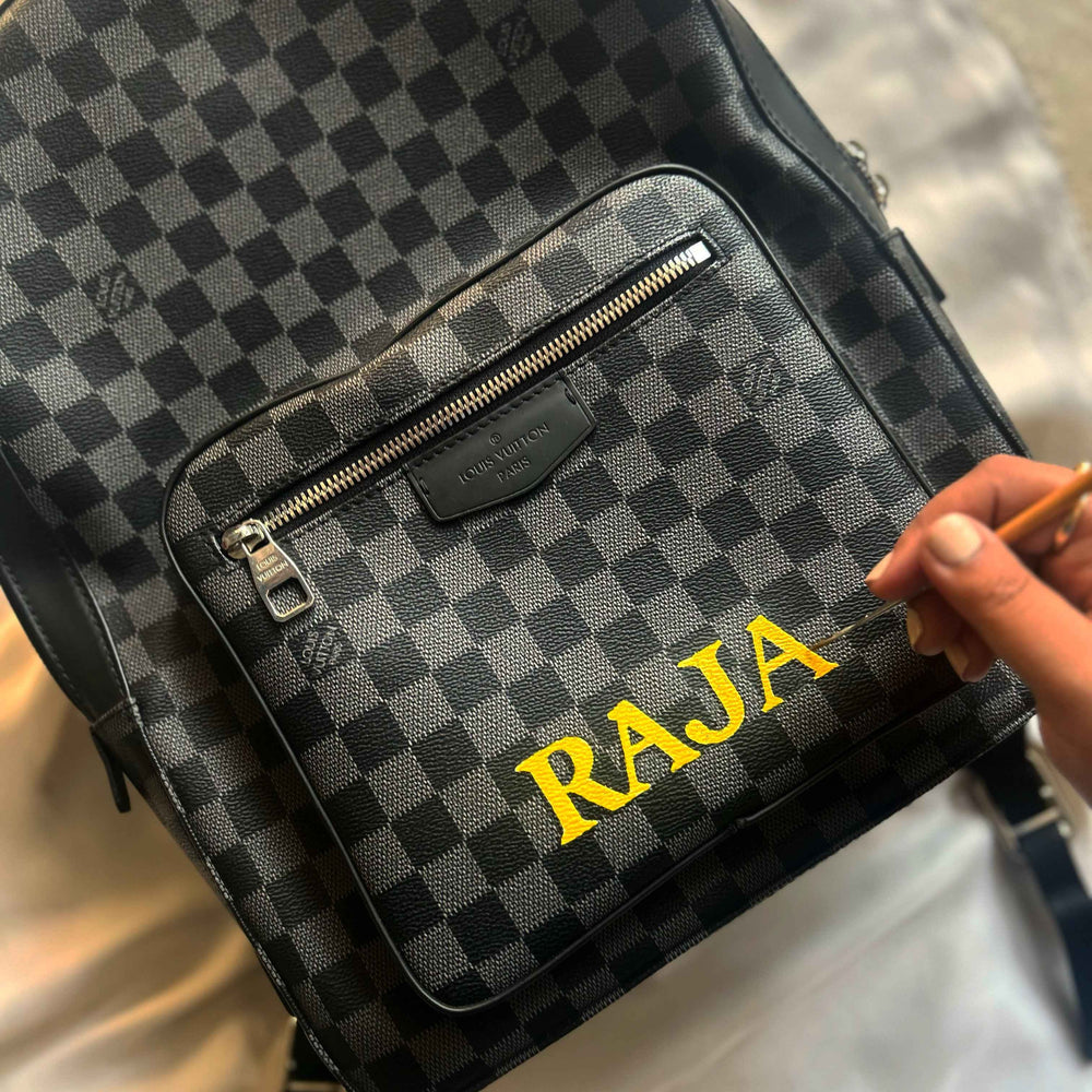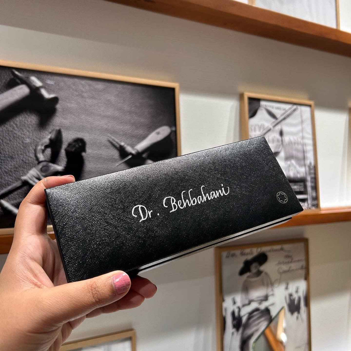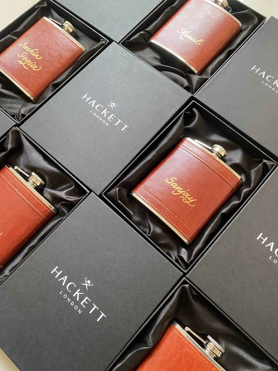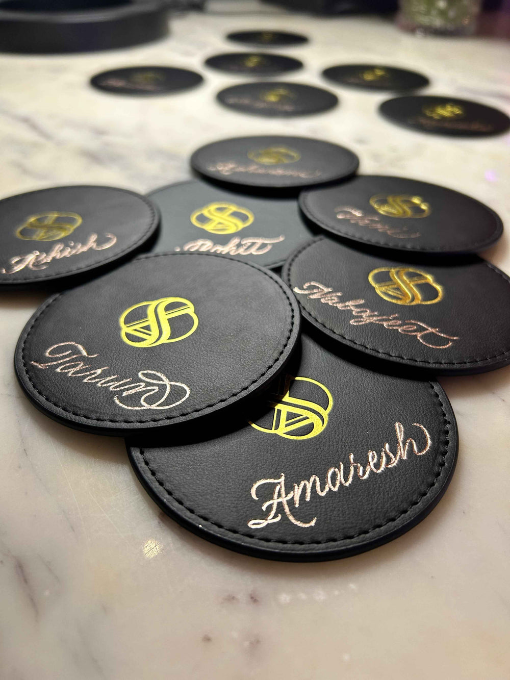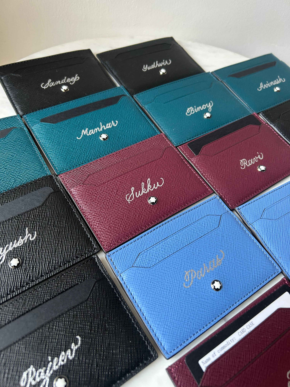 I offer personalisation on a variety of leather products- including card holders, bags, luggage tags, Coasters, Hip-flasks, Jewellery boxes and more. Calligraphy is done either with a foiling tool or with a metallic marker-the result being semi permanent in either case.